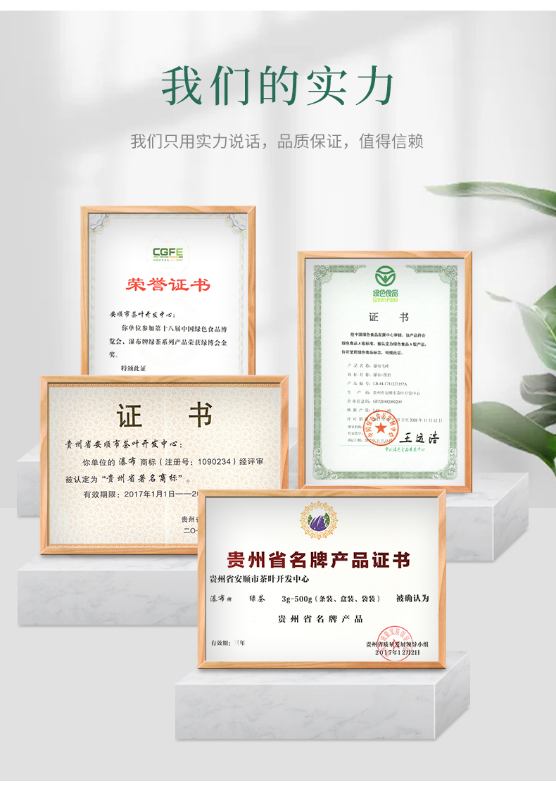 瀑布茶品牌是安順市人民政府主打茶葉品牌,省級重點(diǎn)打造區(qū)域公共品牌,屬貴州五大名茶,先后獲得獲“中國農(nóng)產(chǎn)品區(qū)域公用品牌”、“貴州省著名商標(biāo)”、“貴州省名牌產(chǎn)品”等榮譽(yù)稱號。近年來,在各級部門大力推動(dòng)下,瀑布茶品牌不斷發(fā)展壯大。截止目前,現(xiàn)有瀑布茶品牌加盟企業(yè)23家,輻射茶園面積200000余畝,其中綠色食品認(rèn)證茶園基地面積7000余畝,有機(jī)食品認(rèn)證基地面積2500畝。擁有“瀑布毛峰”、“瀑布翠芽”、“瀑布紅茶”、“瀑布翠龍”等產(chǎn)品,多次獲得“中綠杯”、“中茶杯”、“華茗杯”等大獎(jiǎng);分別榮獲第14屆中國國際農(nóng)產(chǎn)品交易會金獎(jiǎng)、第18屆中國綠色食品博覽會金獎(jiǎng)、“黃山杯”首屆全國傳統(tǒng)名茶產(chǎn)品質(zhì)量特別金獎(jiǎng)、安順十大旅游商品等殊榮及稱號。