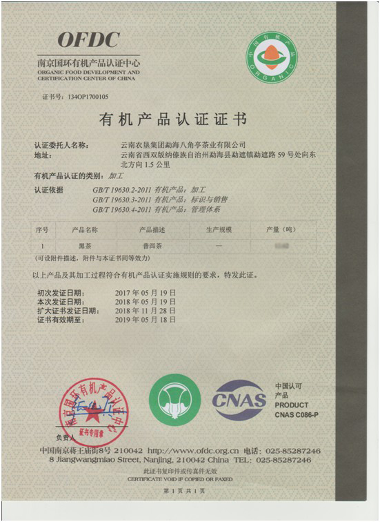云墾茶業集團下屬茶葉生產企業——云南農墾集團勐海八角亭茶業有限公司原名黎明茶廠,是我國歷史最為悠久的茶企之一,曾位列“中國普洱茶十大知名品牌”“十大最受歡迎茶葉品牌”、“中國普洱茶十大暢銷品牌”中,成為今天市場上最有影響力的品牌之一。公司產品獲得“綠色食品”、ISO9001、 HACCP和云茶品牌(YC)4項認證,連續獲得“云南名牌農產品”“云南名牌產品”“云南省著名商標”等品牌榮譽,公司生產的多款普洱茶在歷次專業評比中多次獲得特等金獎和金獎。在2018第五屆中國企業五星品牌論壇上,云南農墾集團勐海八角亭茶業有限公司上榜中國普洱茶行業影響力品牌——“金芽獎”,公司負責人陳勝軍先生獲“陸羽獎”,被授予2017“國際十大杰出茶人”榮譽稱號。