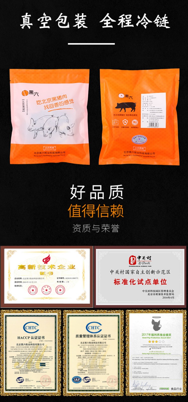公司利用北京黑豬自有知識產(chǎn)權(quán),通過科技支撐,建立了從基地到餐桌的安全、優(yōu)質(zhì)食用農(nóng)產(chǎn)品加工的全程可追溯體系,“黑六”高品質(zhì)豬肉受到廣大消費(fèi)者關(guān)注和接受。隨著北京黑豬全產(chǎn)業(yè)鏈的延伸和發(fā)展,公司獨(dú)創(chuàng)的“黑六”品牌日益受到消費(fèi)者青睞。“黑六”產(chǎn)品通過超市專賣、直銷、電商、餐飲等渠道步入了千家萬戶。被淡忘和追尋的肉嫩味美的北京黑豬肉通過黑六團(tuán)隊(duì)的精心打造,再度成為消費(fèi)者舌尖上的享受、餐桌上的靚麗一景。