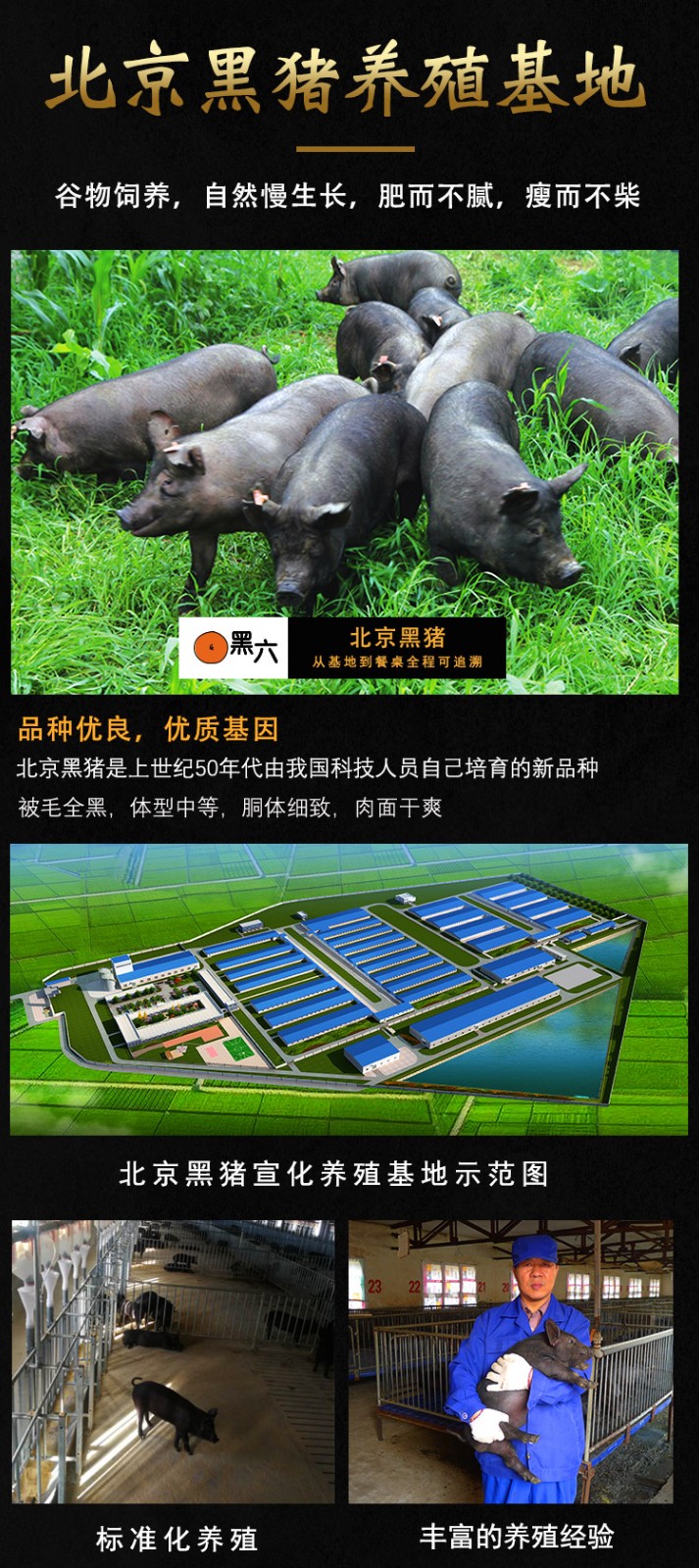 北京黑六牧業(yè)科技有限公司隸屬于首農(nóng)集團(tuán)北郊農(nóng)場,位于昌平區(qū)小湯山現(xiàn)代農(nóng)業(yè)科技示范園西區(qū)。唯一擁有北京黑豬種質(zhì)資源,是集北京黑豬品種保護(hù)、育種、科研、開發(fā)、“黑六”食品加工、銷售、試驗(yàn)示范、技術(shù)服務(wù)于一體的牧業(yè)科技型企業(yè),不僅是國家高新技術(shù)企業(yè),也是北京黑豬國家級農(nóng)業(yè)標(biāo)準(zhǔn)化示范區(qū)和農(nóng)產(chǎn)品質(zhì)量良好級標(biāo)準(zhǔn)化生產(chǎn)基地。